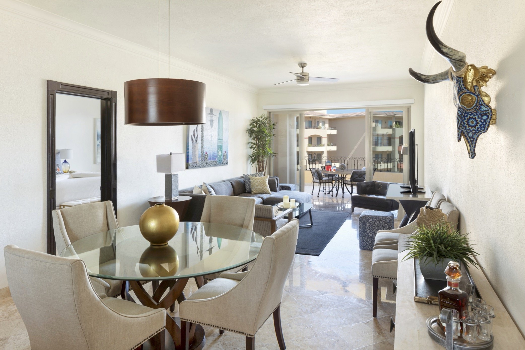 Step into over 2,100 square feet of refined oceanfront living, where floor-to-ceiling glass doors, ten-foot ceilings, and a light coastal palette create an airy, welcoming retreat. From the moment you enter Villa 2706, your gaze is drawn straight out to the shimmering Sea of Cortez, with iconic Land’s End visible from the spacious terrace.